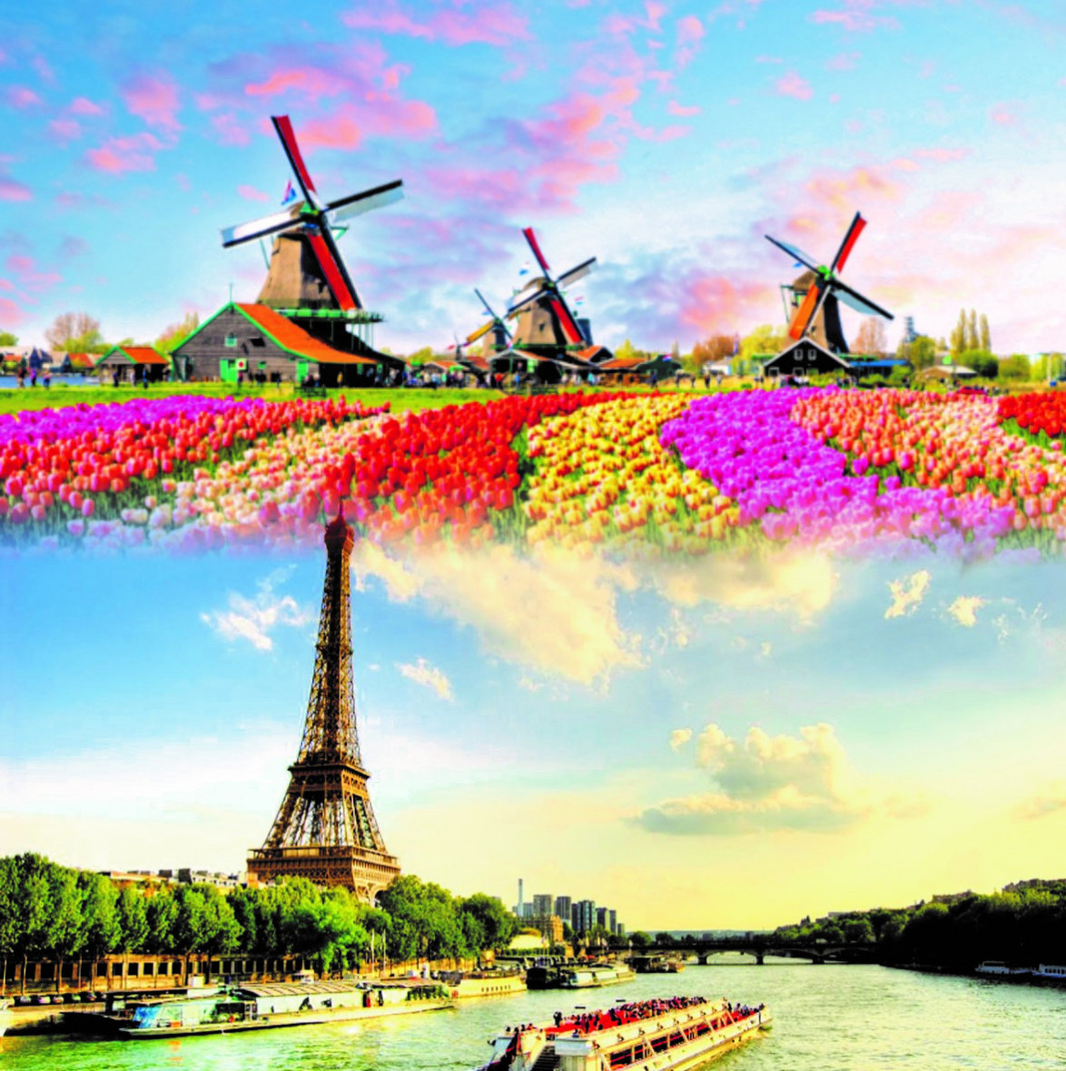 Berkeliling Eropa Barat diawali dari kota seribu kanal, Amsterdam, ibukota negara Belanda. Mengunjungi desa kincir angin Zaanse Schans, kampung nelayan Volendam, kota Rotterdam, Den Hague dan juga pusat pengrajin keramik di Delft. Dilanjutkan ke Belgia mengunjungi kota Antwerpen dan Brussels, sebelum menuju Paris. Di Paris tentunya wajib mengunjungi menara Eiffel, istana Louvre, Arc de Triomphe dan berbelanja di Galleries Lafayette yang terkenal. Perjalanan akan dilanjutkan menuju Luxembourg, negara kecil dengan panorama indah mempesona. Terakhir kita akan singgah di kota Cologne, Jerman. Kota tua bersejarah di tepi Sungai Rhine.